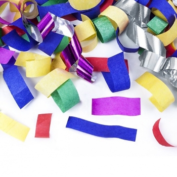 - Form: bunte und metallisch glänzende Luftschlangen