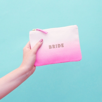 Das perfekte Accessoire für die bezaubernde Braut! Diese kleine Tasche ist ideal, um alle wichtigen Kleinigkeiten, auf die eine Braut am Hochzeitstag nicht verzichten kann, zu verstauen. Außerdem ist sie perfekt um nach dem großen Tag ein sehr schönes Andenken daran zu haben. Die Clutch kann zum Beispiel auch nach dem Hochzeitstag als Schminktäschchen benutzt werden und erinnert so Tag für Tag liebevoll an die Hochzeit. Das Design mit dem metallic goldnenen Schriftzug "BRIDE" und dem hübschen Ombre Farbübergangseffekt von Rosa ins Weiße ist ein Blickfang.